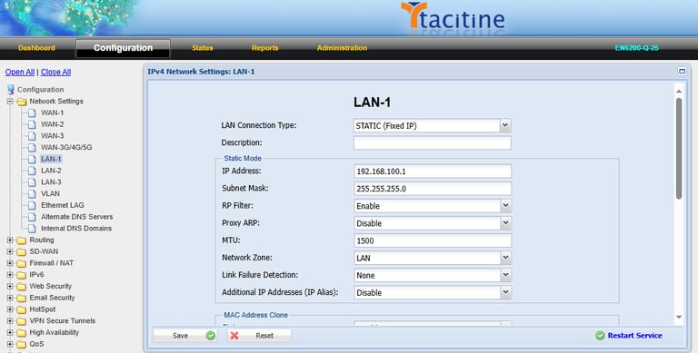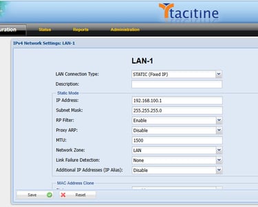 Step 1: Login to the Tacitine. (If you are configuring the Tacitine for the first time, the default Lan IP is https://192.168.100.1:4433)and default username: admin & Password: admin99