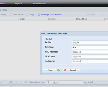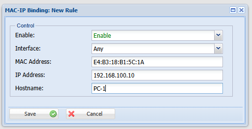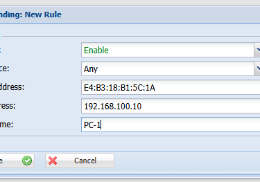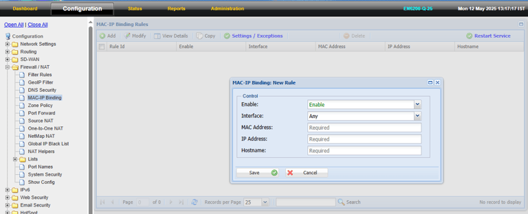 Step 2: Click the Configuration > Firewall /NAT > Mac-Ip Binding > Add
