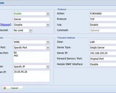 Step 4: Incoming zone: This field is mandatory and specifies the source zone criteria for the rule. In other words, this rule will be applied on the connection request only if the source zone and other parameters defined in the rule match with the connection request and the Original Services Port: 80,443 Original Destination: mention the Wan IP address for e.g.: 25.65.45.26