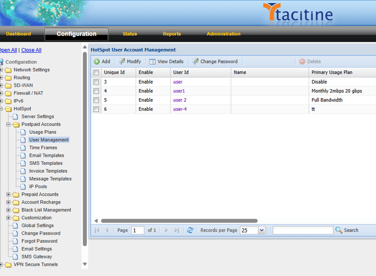 Step 1: Login to the Tacitine. (If you are configuring the Tacitine for the first time, the default Lan IP is https://192.168.100.1:4433)and Default username: admin & Password: admin99