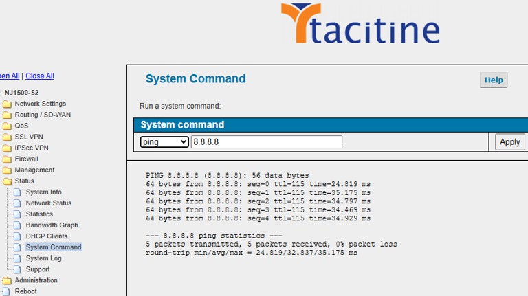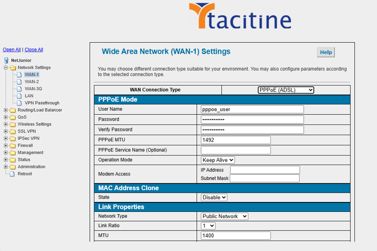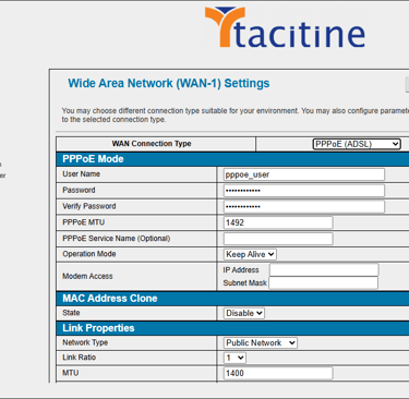 Step 1: Login to the Tacitine. (If you are configuring the Tacitine for the first time, the default Lan IP is https://192.168.100.1)and Default username: admin & Password: admin99